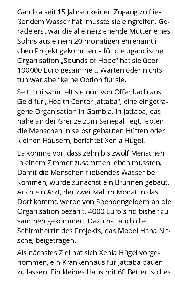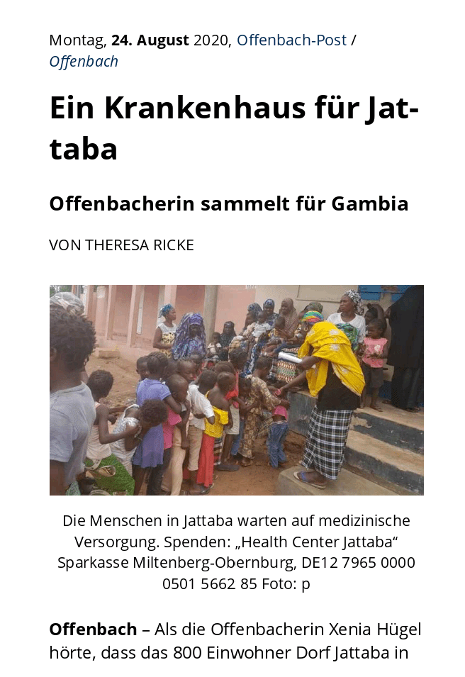 NEWS Veröffentlicht am 31. August 2020 von Xenia Hügel …gerade erst entdeckt… Danke #offenbachpost 💪❤ …und wir sind unserem großen Ziel schon wieder (+2000€) näher… ✌#Krankenhaus #Jattaba #Gambia ☉ Teilen mit: Klicke, um auf X zu teilen (Wird in neuem Fenster geöffnet) X Klick, um auf Facebook zu teilen (Wird in neuem Fenster geöffnet) Facebook Gefällt mir Wird geladen … Ähnliche Beiträge Veröffentlicht von Xenia Hügel In dir ist diese Kraft. Zeige alle Beiträge von Xenia Hügel
