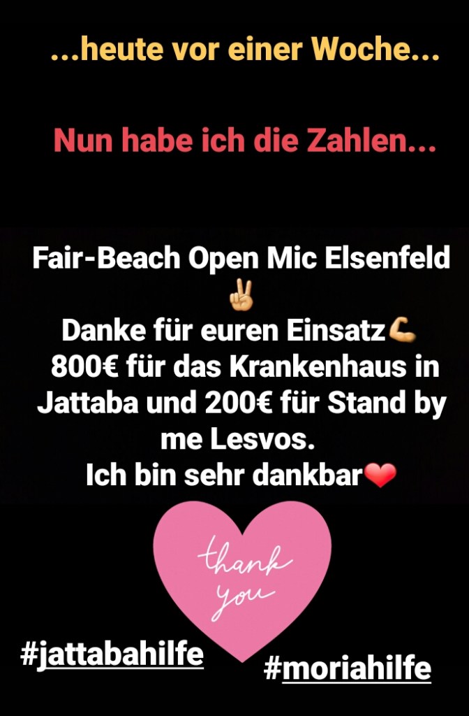 Heute vor einer Woche… ❤Danke für den mehr als starken Einsatz💪💪💪💪💪!!! DANKE ELSENFELD!🍀DANKE AN ALLE KÜNSTLER & DAS PUBLIKUM 😍DANKE Holle & Werner Billmaier✌❤🍀!! Schön, dass wir gemeinsam helfen können. 💋 #elsenfeld #openmic #charity #jattaba #lesbos #gambia #griechenland #danke
