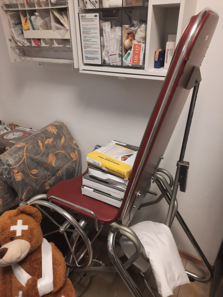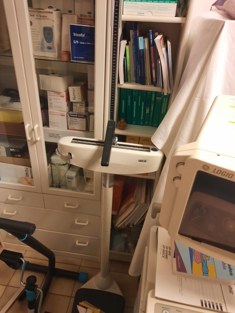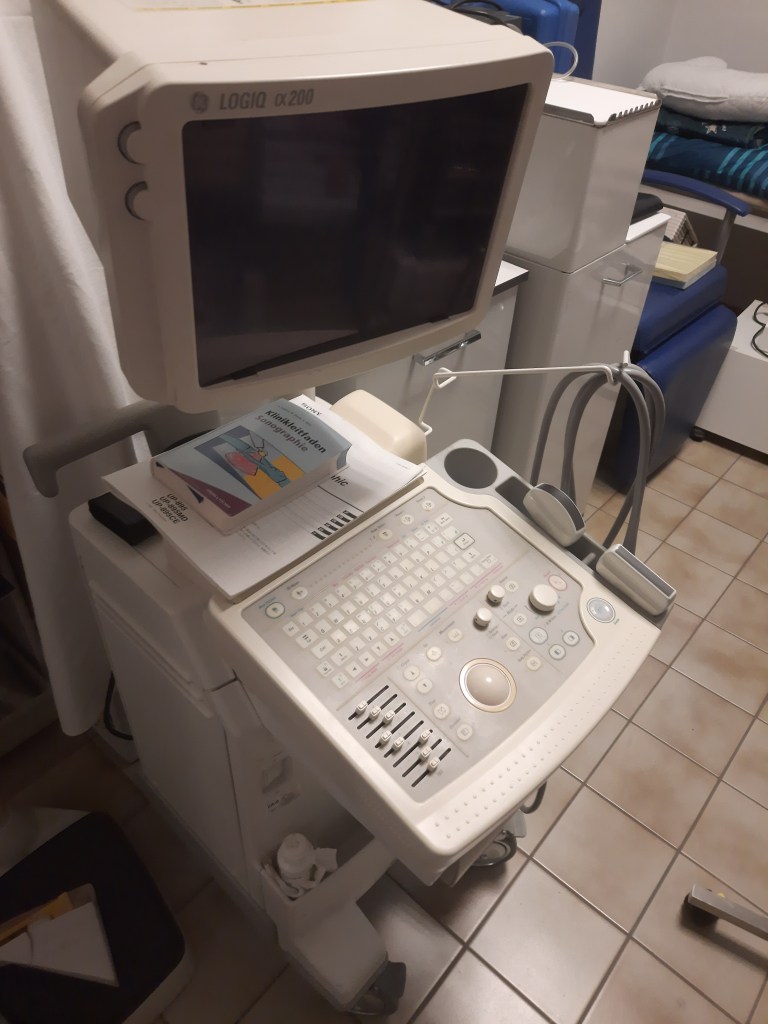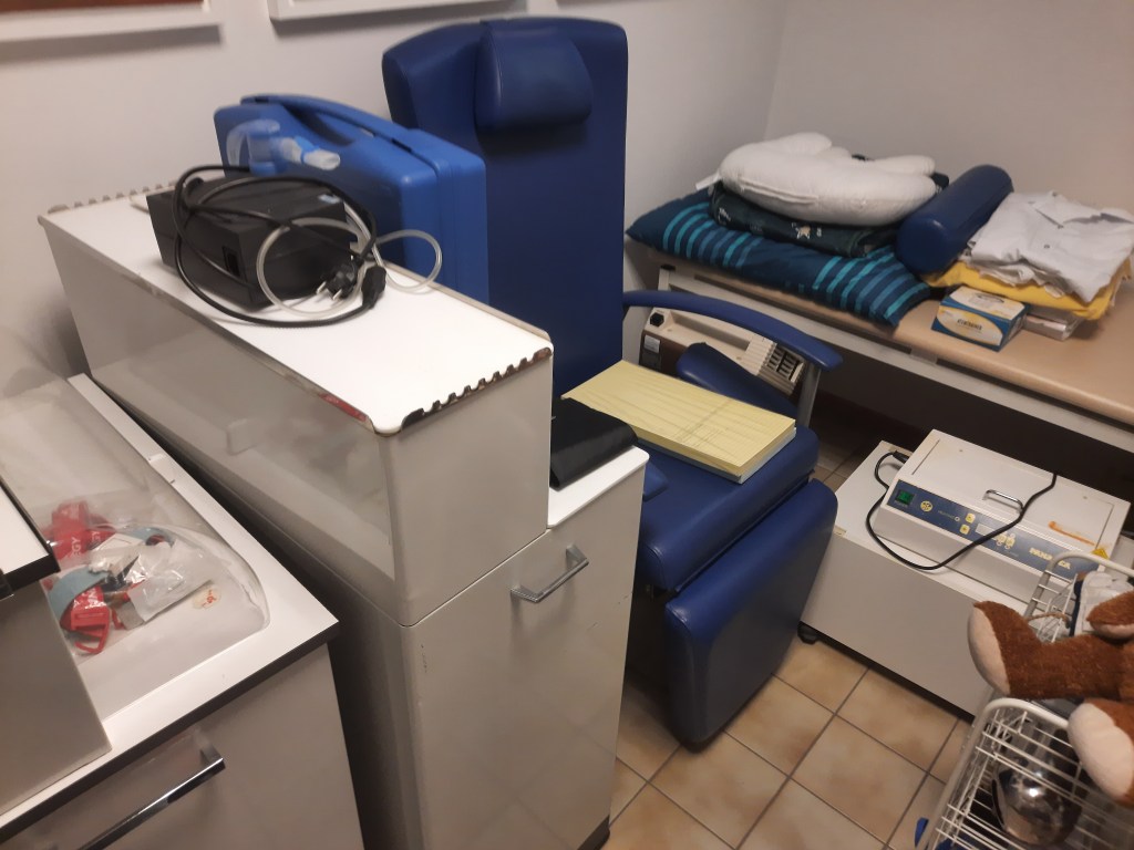 Röntgengerät, Drucker, Monitore, Werkzeug, Mülltonne, Toiletten und Waschbecken sowie Armaturen Brillen, Bürostühle Büromaterial, Lampen allg. OP Lampe, Waage,Ultraschallgerät Utensilien Infusion, Gynäkologischer Stuhl inkl. Zeiss Optik,Stuhl zur Blutabnahme Medizinschränke, Gefäßdoppler, Verbandszeug Nierenschalen, Sterilisator Medizinkoffer,Liege plus Auflage Arbeitskittel,Oxymat Karteikarten,Blutzuckergerät,Ruther Schienen Spritzen,Nadeln,Urinbecher,Infusionslösung, Thermometer, Mikroskop, Utensilien OP,Garderobe, Schreibtisch, Rollstühle u. Rollatoren,5 Krankenhausbetten, Bettwäsche, Handtücher, Waschlappen, Bettzeug Toilettenstühle,Blutdruckmessgeräte,Stühle für den Wartebereich, Unterlagen für Matratzen, Mund- Nasenschutz, EKG Aufnahmegerät, Stethoskope, Krücken