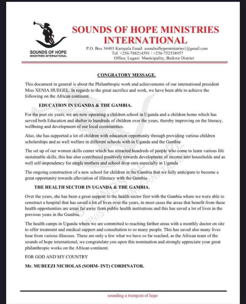 Through her tireless efforts, Xenia Hügel has demonstrated that one individual can make an extraordinary difference in the lives of many. Her work in Uganda and The Gambia is a testament to her vision of a world where every person, regardless of their circumstances, has access to opportunities, health, and dignity.
